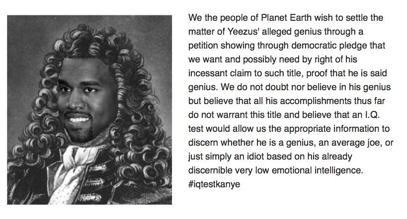 I was turned on to this petition by a “friend” from high school (I use the word “friend” loosely because I grew up behind the Orange Curtain, and don’t consider my high school peers to be comrades in arms), who was soliciting signatures on her Facebook page; or perhaps circulating the petition in an attempt to mock Kanye West’s reputation as an “idiot savant”.